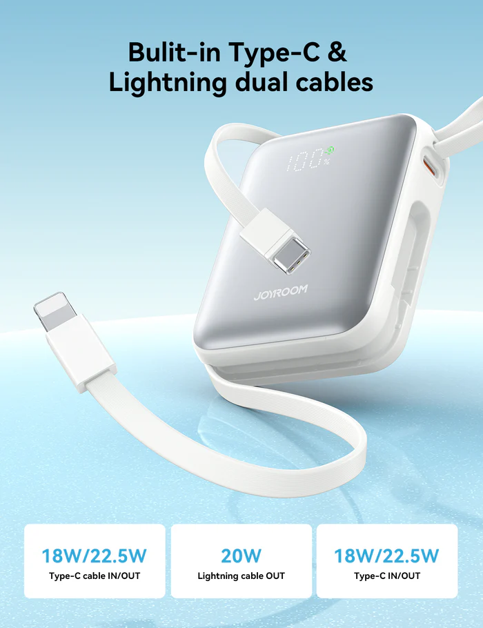 The primary appeal of this device is its “Mini” form factor. Unlike traditional power banks that require you to carry a tangled mess of wires, the JOYROOM JR-PBF27 22.5W 10000mAh Mini Fast Charging Power Bank with Lightning & Type-C Dual Cables features integrated cables that tuck neatly into the chassis. Its sleek, rounded edges and premium finish make it feel more like a high-end tech accessory than a heavy battery pack.